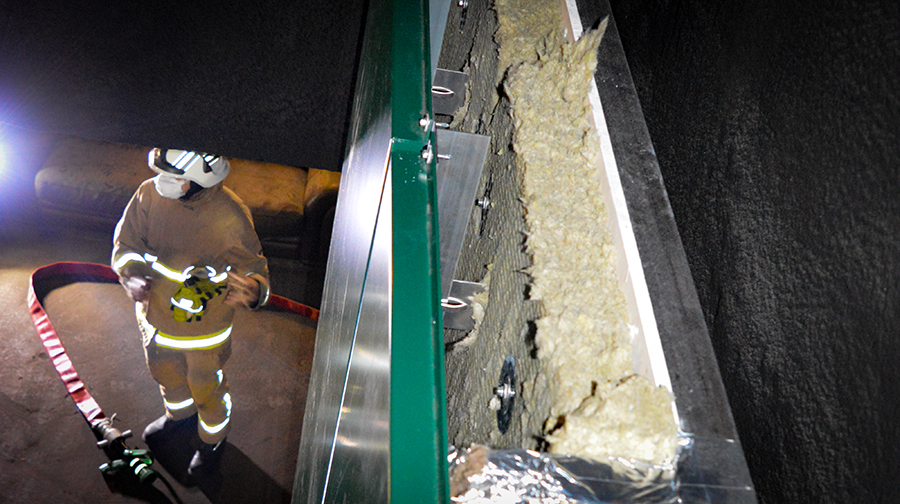 The specified 3mm aluminium Genius Prime system was constructed above an opening which simulated a window with back draft, inside the space was 5kw of fuel.
